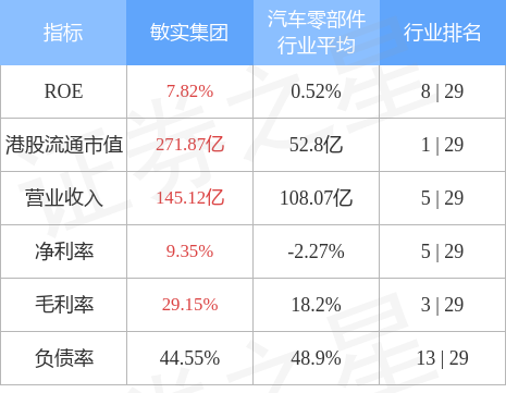敏实集团港股市值271.87亿港元,在汽车零部件行业中排名第1。主要指标见下表:
