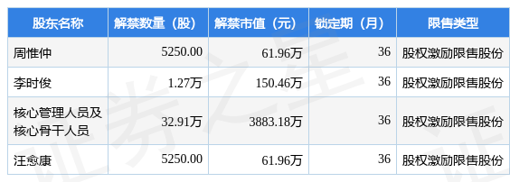 根据市场公开信息整理,捷佳伟创(300724)(300724)于2月13日将有35.23万股限售股份解禁上市,为公司股权激励限售股份,占公司总股本0.1%。最近一年内,该股累计解禁40.45万股,占总股本的0.12%。本次解禁后,公司还有7476.89万股限售股份,占总股本21.47%。具体如下图所示: