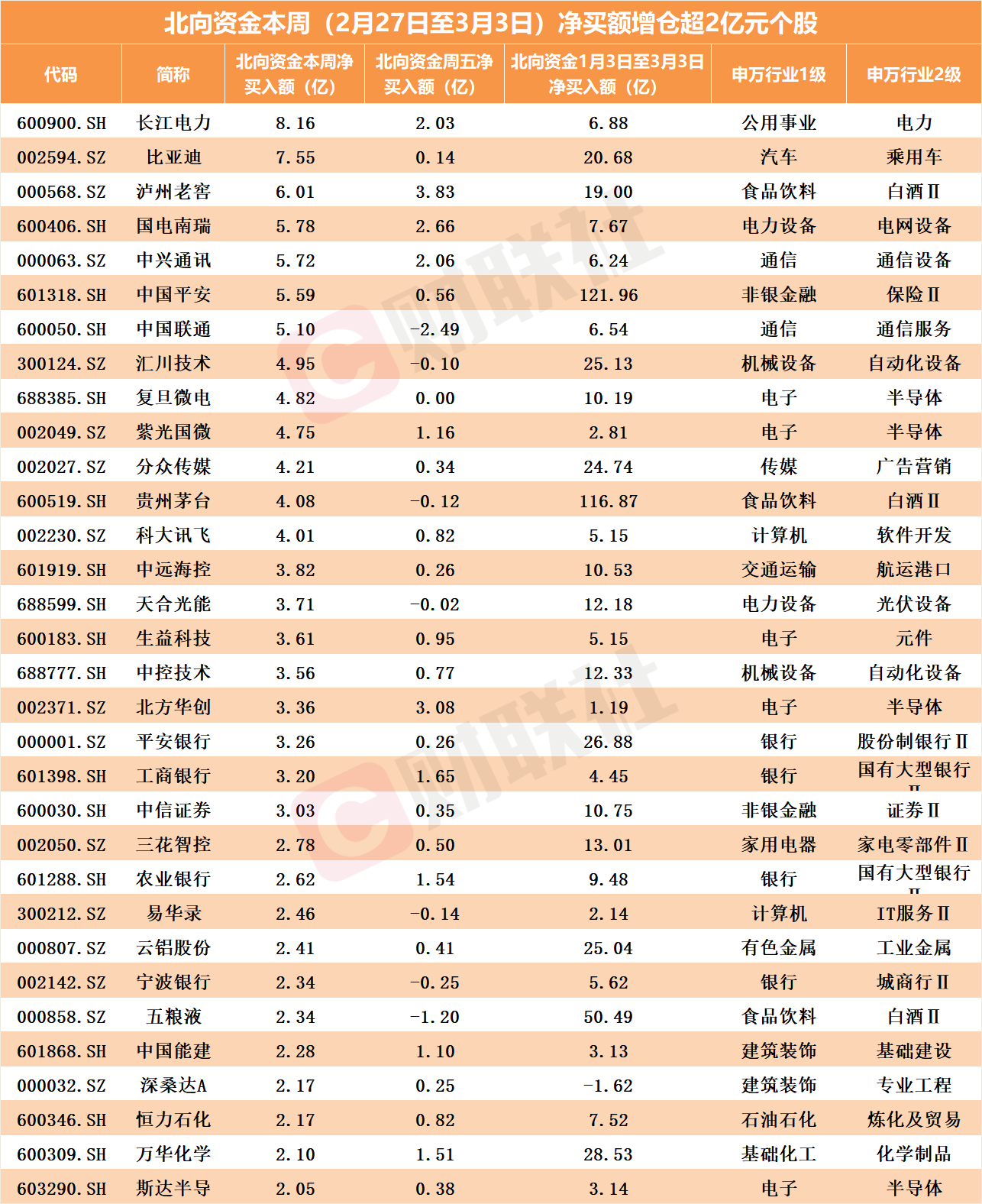 财联社3月4日讯(编辑 笠晨)在上证指数收复3300点的过程中,北向资金也加了把力,本周净买入66.18亿元。虽然整体净买入规模不算大,但从行业板块视角看,还是有不少“精彩内容”。