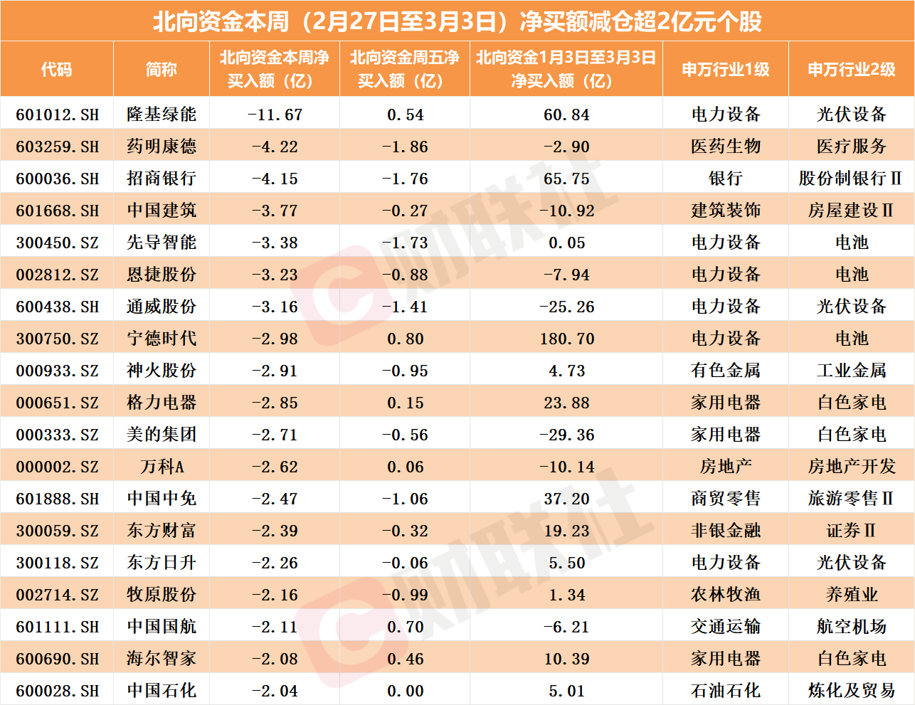 卖出一侧,本周19只个股北向资金累计净卖出额超2亿元(见下表)。其中,各有3只个股上榜的是白色家电(格力、美的、海尔)、电池(先导智能(300450)、恩捷股份(002812)、宁德时代(300750))、光伏设备(隆基绿能、通威股份(600438)、东方日升(300118))。隆基绿能本周惨遭北向资金净卖出11.67亿元,居沪深A股之首。